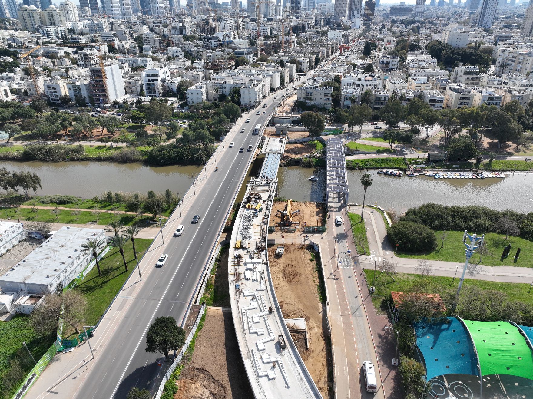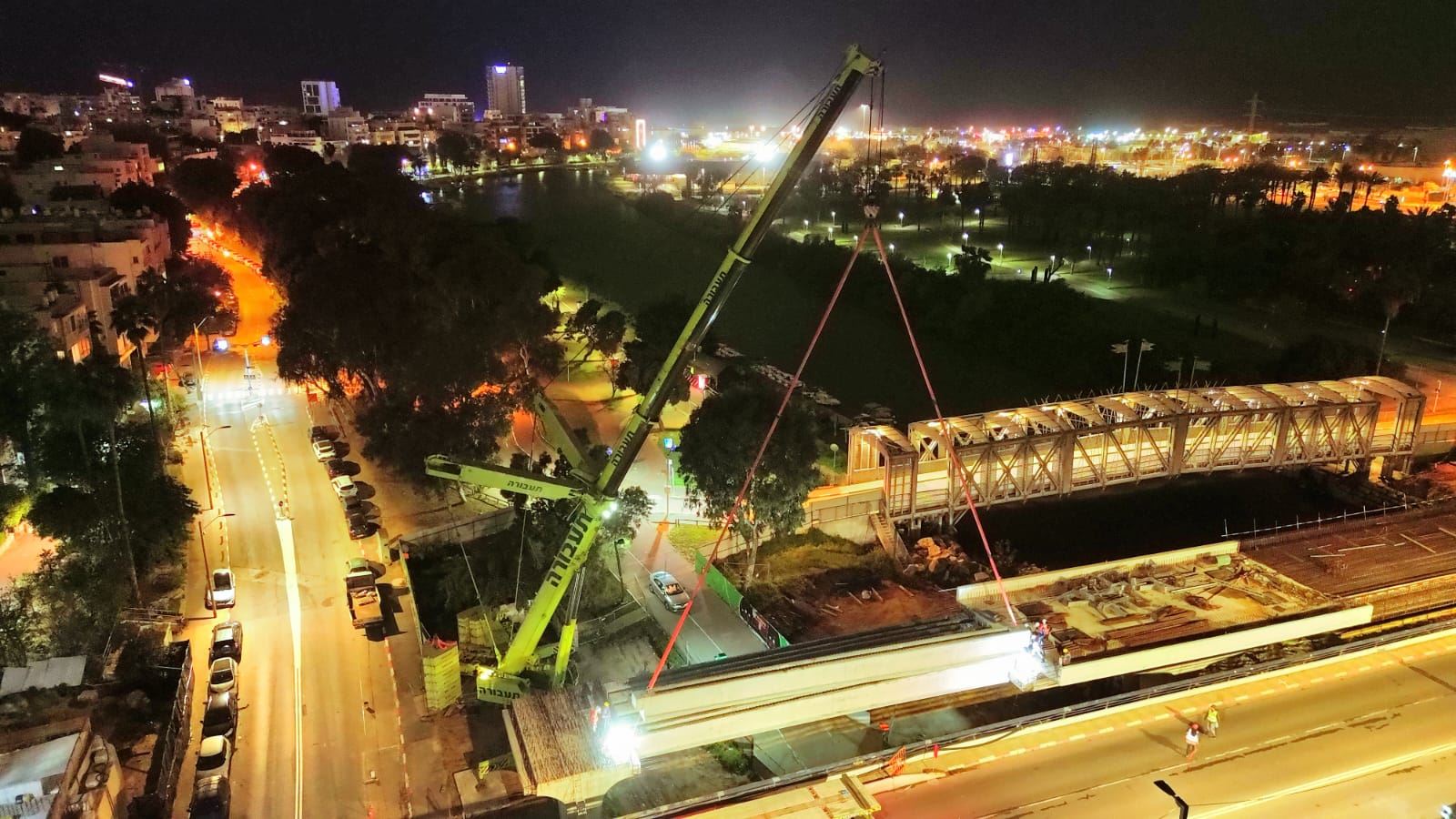 הרכבת הקורות בגשר רוקח/הירקון שבקו הירוק